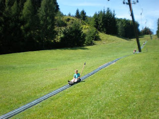 Zuerst wird man mit einer Art Schlepplift mit dem Schlitten hochgezogen, und dann geht es bergab, so schnell es die Situation erlaubt - es gibt nur loslassen oder bremsen.